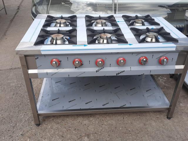 *Aragaz inox pe gaz cu 6 arzatoare pe support cu polita, arzatoare flacara dubl Putere 45 Kw (6 X 7.5KW), dimensiune gratar fonta: 34×33 cm; termocupla de siguranta – norma CE, dimens. 1500x1000x850 mm, Pret 4900 lei + tva